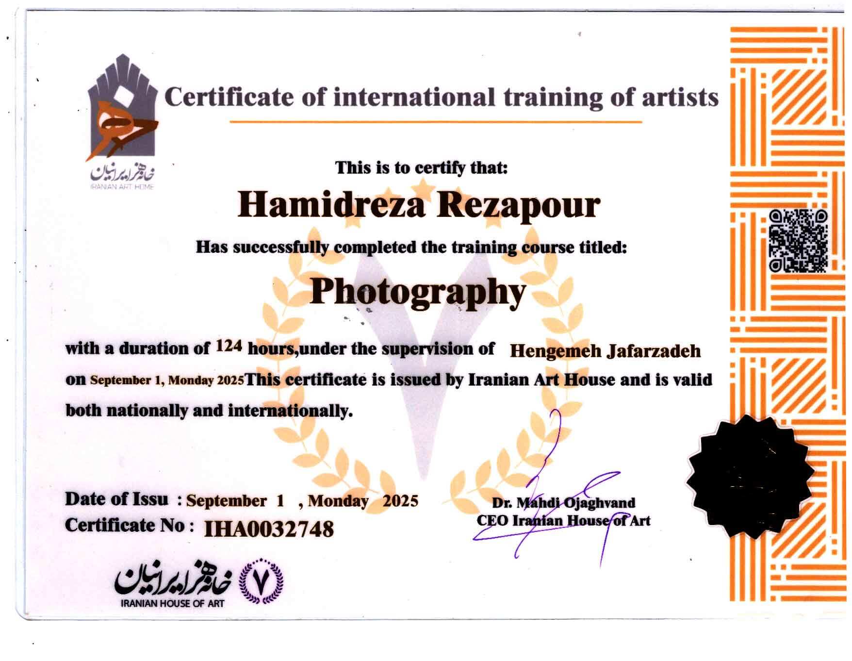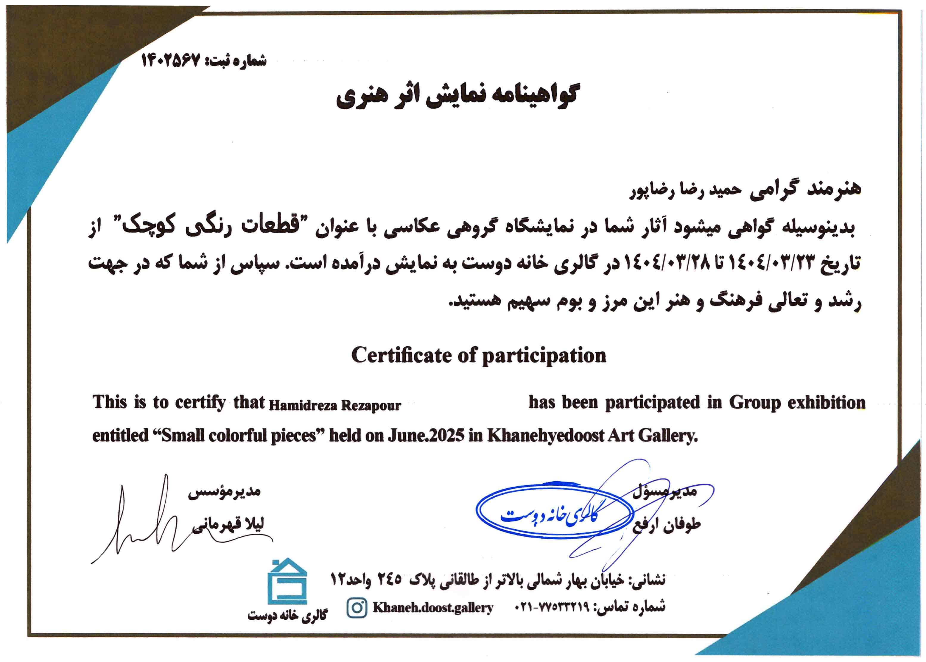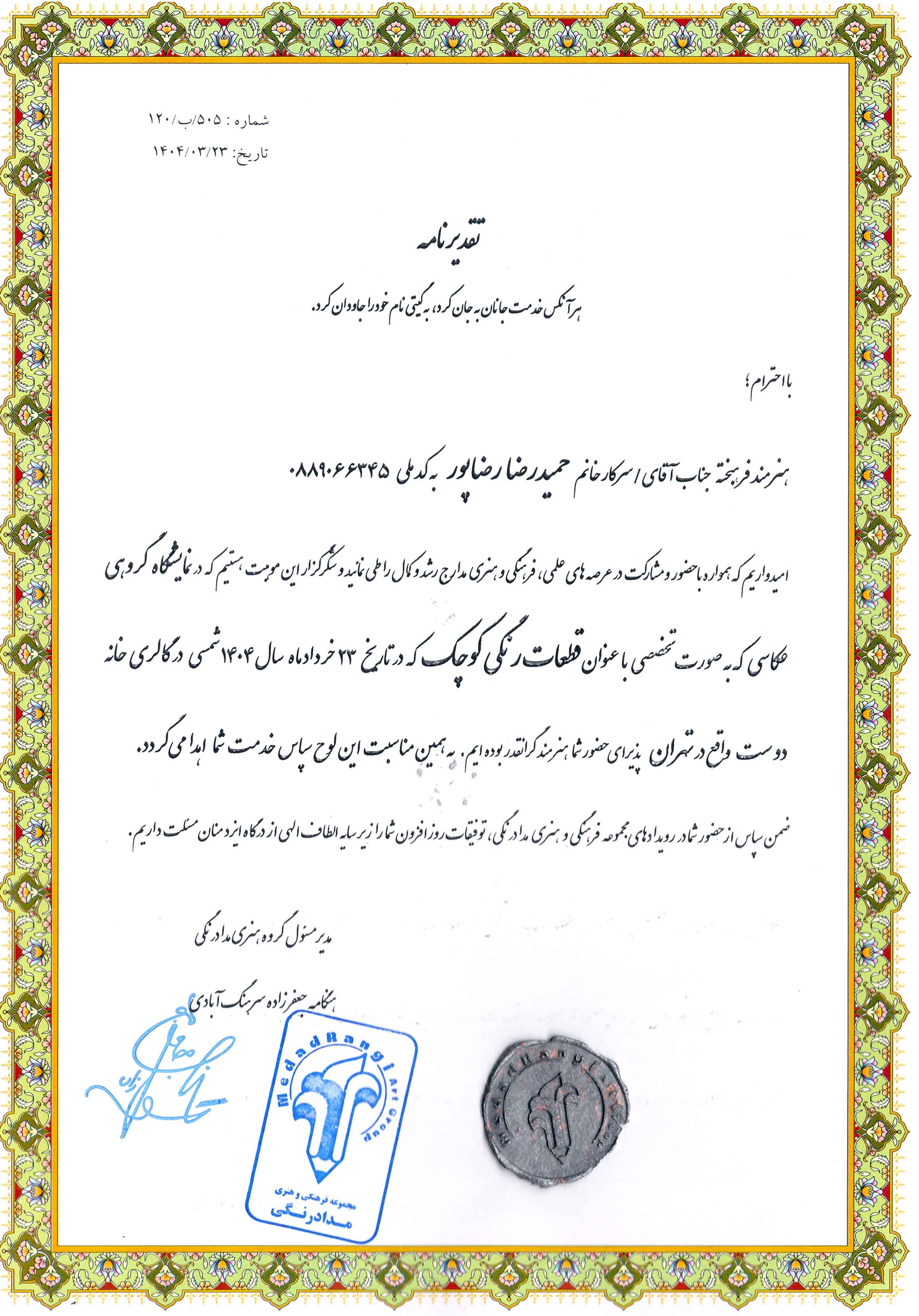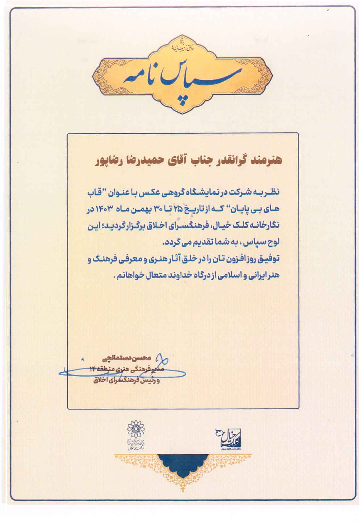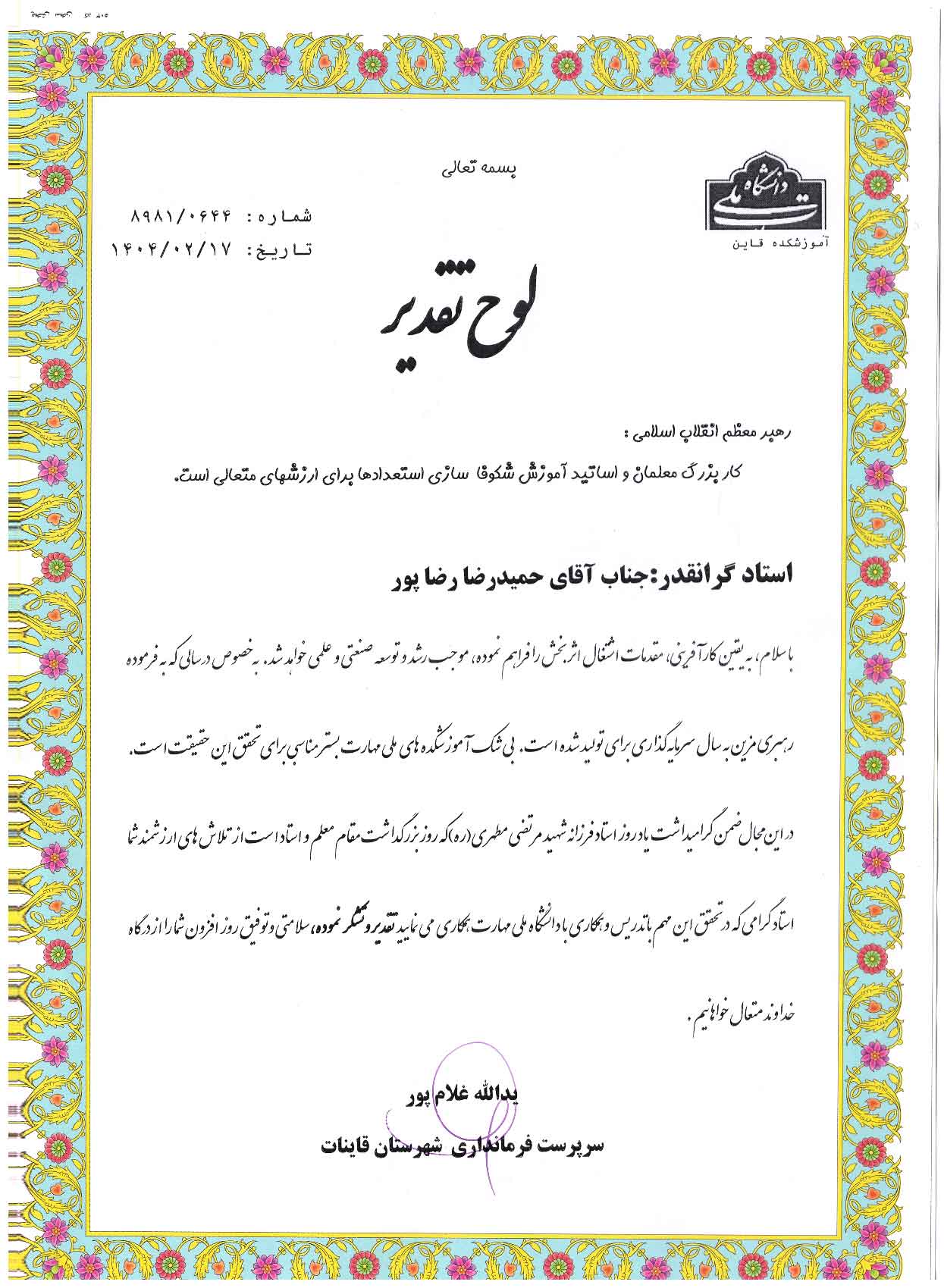 این تقدیرنامه به پاس خدمات آموزشی و انتقال مهارتهای تخصصی در زمینه هنر عکاسی توسط استاد حمیدرضا رضاپور اعطا گردیده است. مشارکت ایشان در پرورش استعدادهای هنری و توسعه فرهنگ بصری در منطقه قاینات، موجب ارتقای سطح هنری دانشجویان شده است.